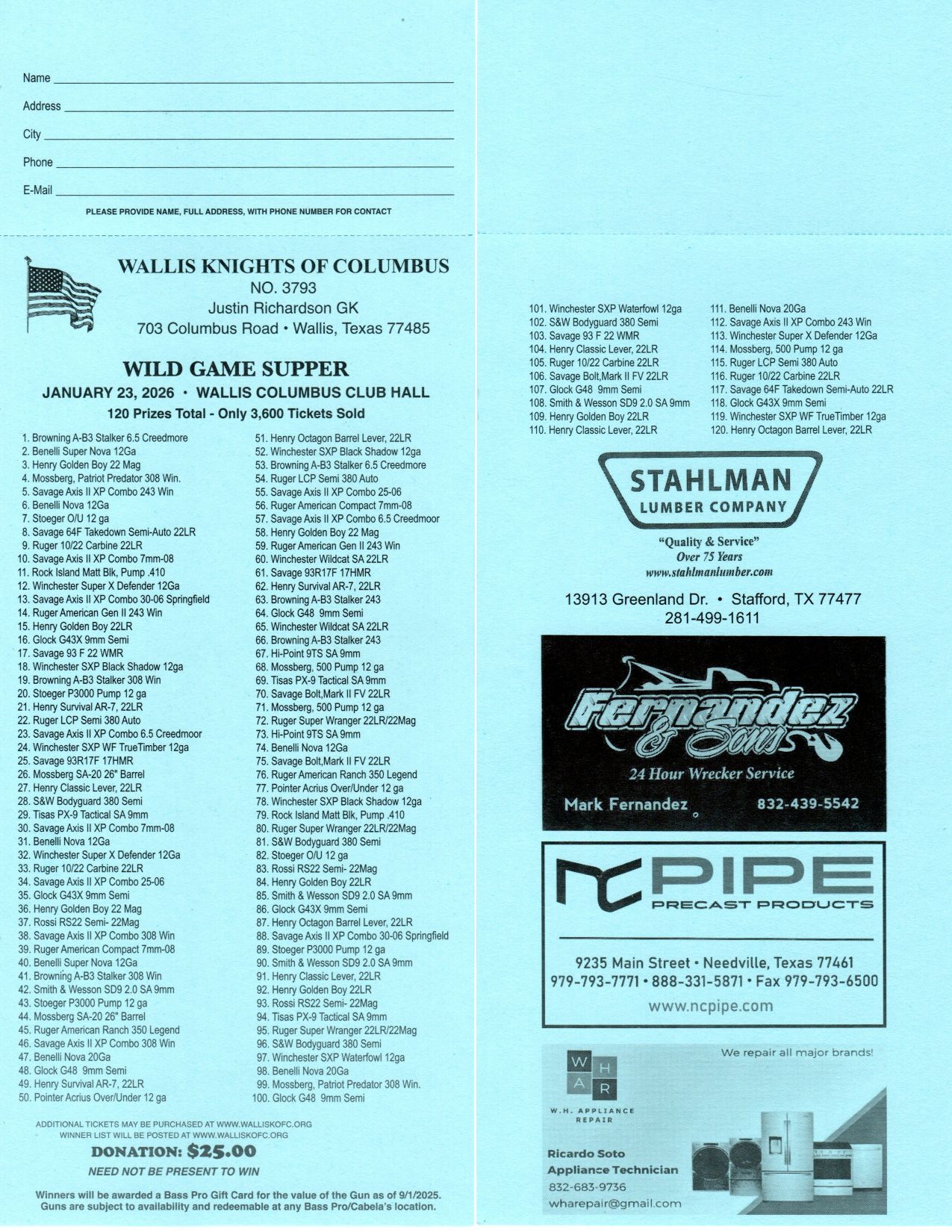 Besides the Grand Raffle which is the highlight of the event, other events to be held are the Penny Pot Luck, Spinning Booth, Bucket Raffle, and Live Auction. All proceeds will be used to support local, Texas Knights of Columbus, and Supreme Knights of Columbus charities. Local charities include support for educational non-profits, scholarships, religious non-profits, emergency preparedness, and the Church.